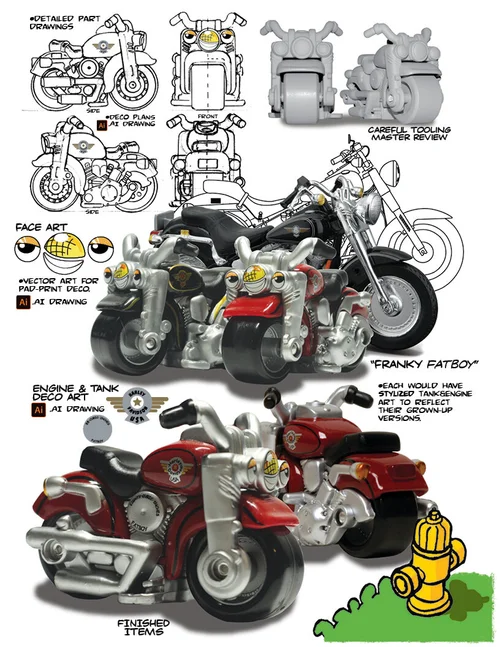 I’ve also had the privilege to create retail toys. Mainly preschool die-cast character based vehicles that followed an existing style as well as generating original styled characters. Many times companies are looking to expand their existing lines and they need new items that still "fit" in with their family of products. I am very familiar with retail toy construction practices as well as the many different ways of decoration that can be used. I try to get as much out of the toy and given molding constrains as possible. Die-cast is very different from injection molded ABS or PVC. The tolerances are different so this has to be understood up front. Retail toys are also blessed with the opportunity of great packaging art that can be created to enhance the play value. The packaging that I have done have mostly been blister cards, and some window boxes. My illustration is good enough that I’m able to do all the mechanical art for the label/stickers as well as instructions and cardboard inserts.